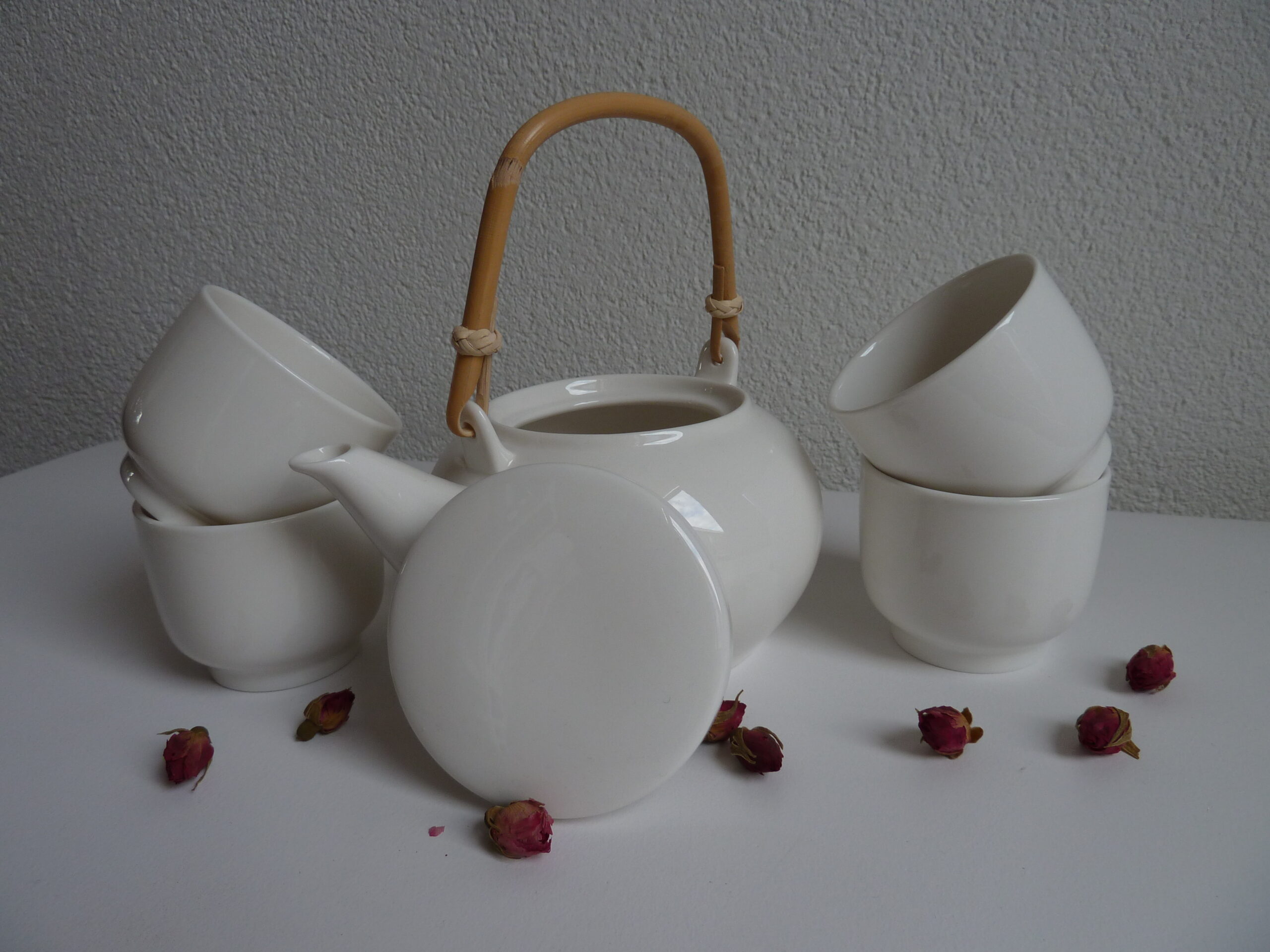 Dit is een tweedehands thee setje (1 theepot en 4 kopjes) van het merk Douwe Egberts. Het setje is nooit gebruikt. Het theepotje is niet groot (ong. 1/2L) en is geïnspireerd door de Chinese ’theemode’.